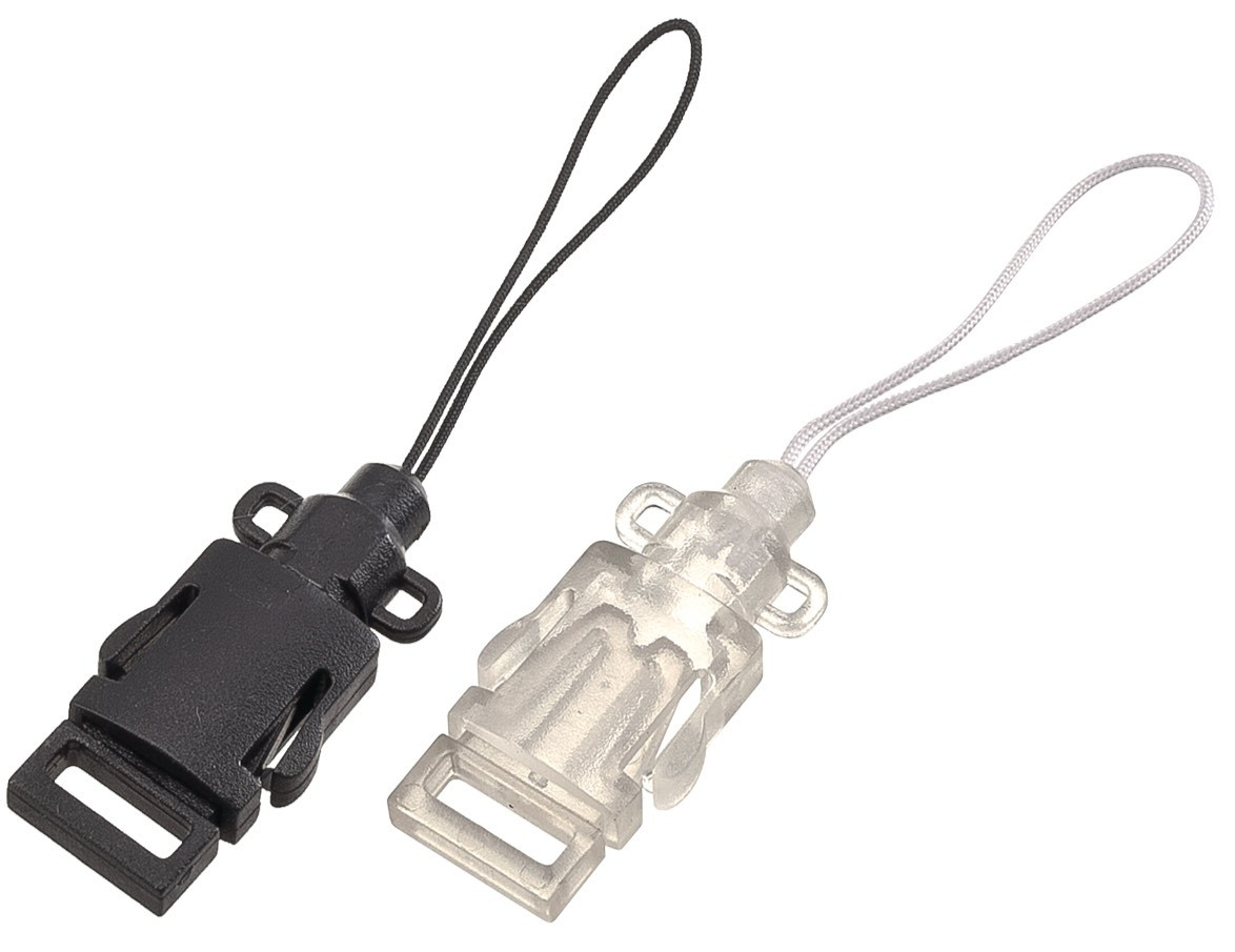 Mini size plastic side release buckle with one side for cord or string, and the other side is for webbing or strap to hang on your neck, it is also widely known as quick detach string connector.